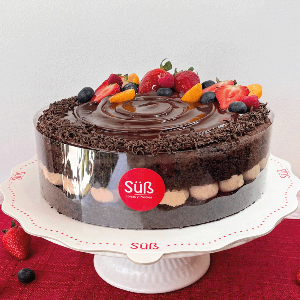 Torta de chocolate con relleno de crema de chocolate, fresas, arandanos, ceresas con jalea de fresas.